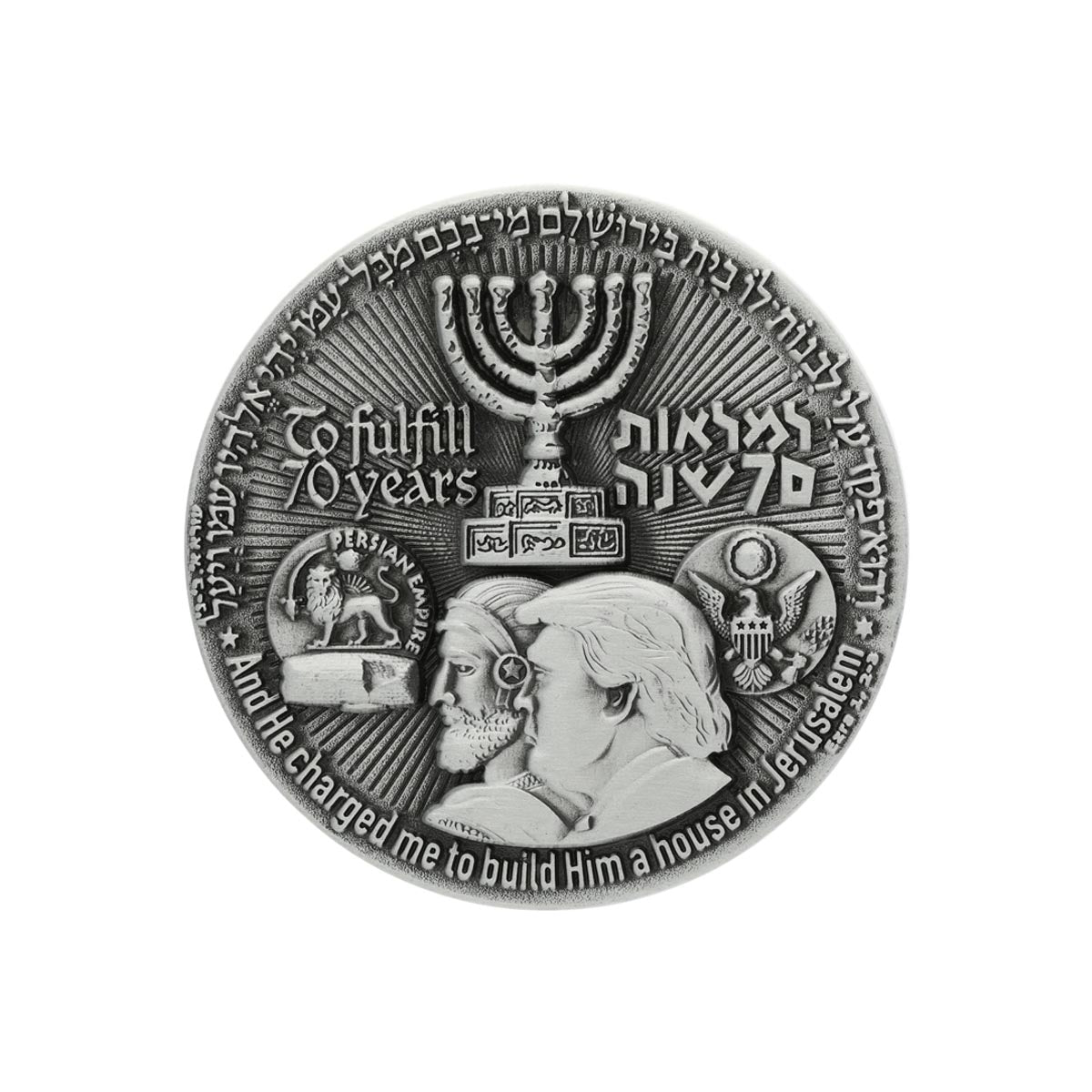 The Legacy of Redemption Set brings together three powerful symbols of Israel's spiritual and historical journey. This set includes the Trump Triumph Medal, the Half Shekel Cyrus TrumpTemple Coin, and the 70 Years Israel Redemption Temple Coin.