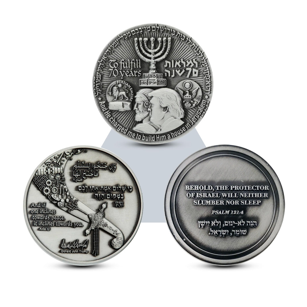 Together, these pieces embody themes of redemption, unity, and visionary leadership, symbolizing Temple Coins’ dedication to celebrating milestones of peace and endurance in Israel’s journey.