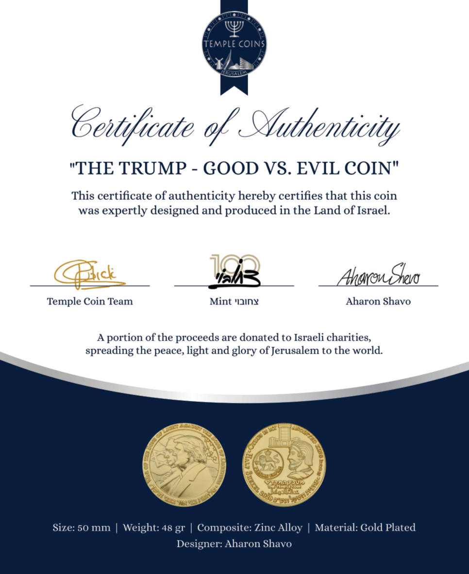 Own the Good Vs. Evil coin, a unique collectible linking Cyrus the Great to the Trump & Netanyahu alliance. Available in 22k gold plate & silver toned.
