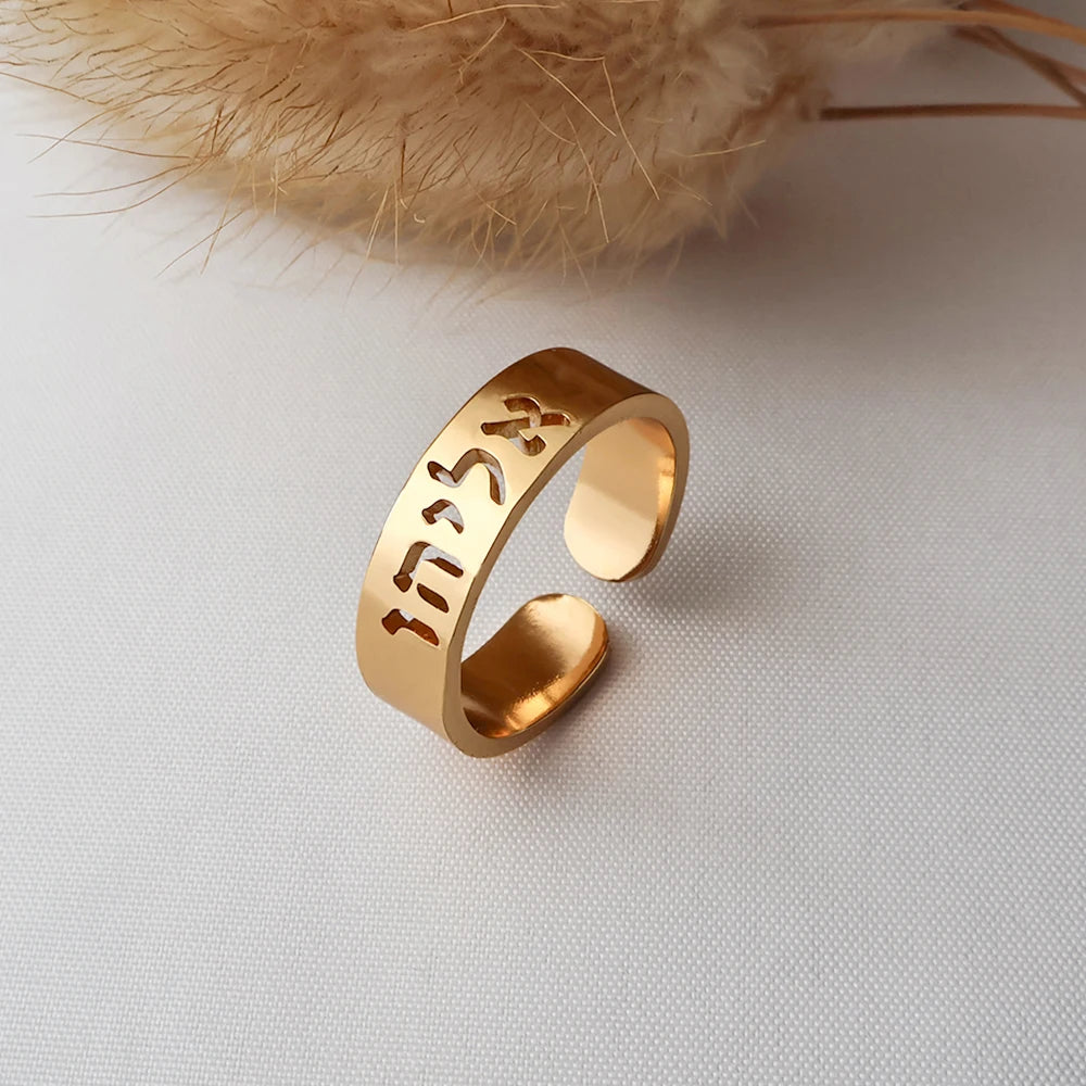 This adjustable ring is crafted from high-quality stainless steel and features a personalized Hebrew name or word of your choice. Whether it represents your name, a loved one, or a word with personal significance, this ring offers a unique way to carry meaning with you every day.