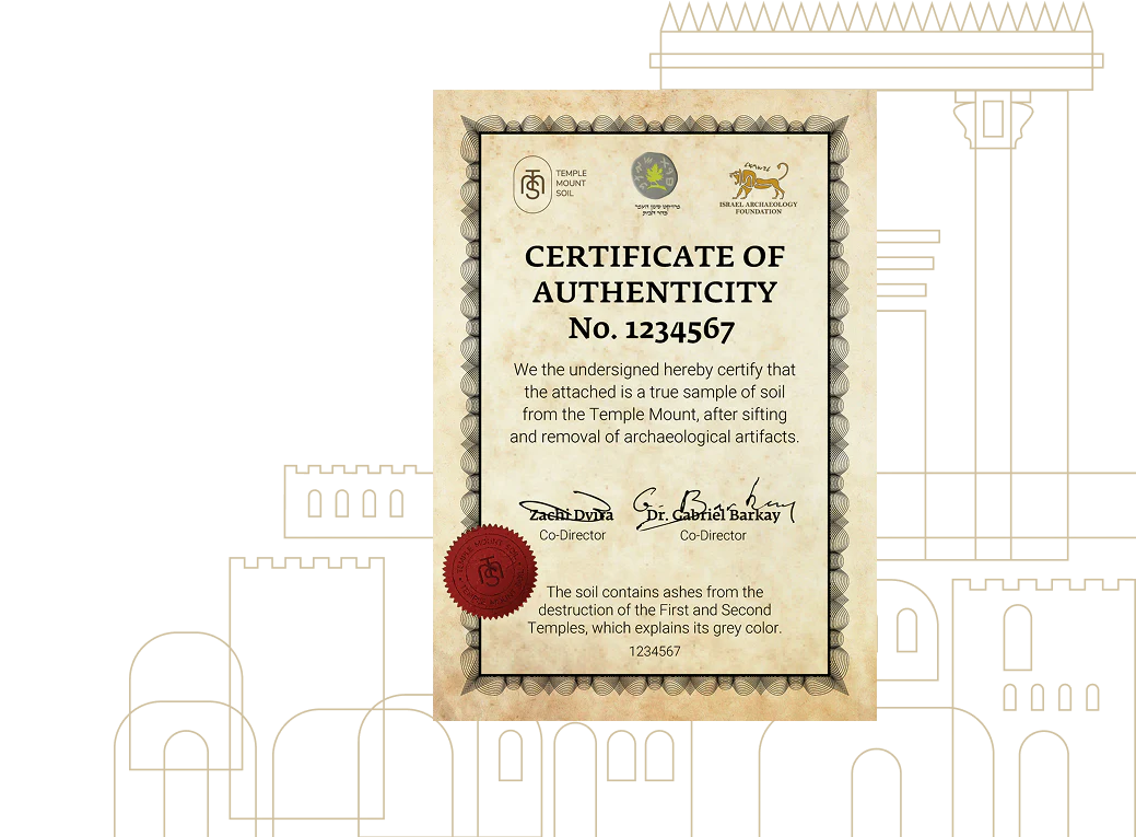 Every grain of soil comes directly from the Temple Mount, recovered through the Temple Mount Sifting Project - the only organization authorized to preserve and verify its authenticity.